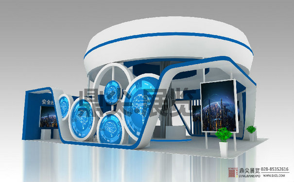 在顏色方麵,藍色具有神秘感和技術感,在展台設計上可以使用藍色或少量的綠色來反映展台的技術。